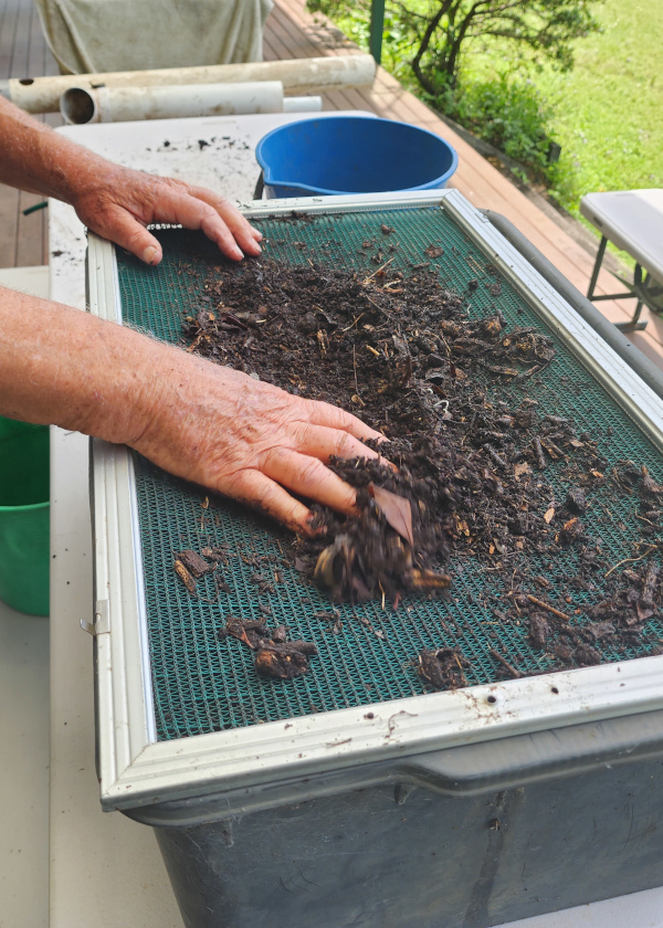 Thoroughly mix the samples and use a large coarse mesh to remove the bulk of sticks and stones. A finer mesh, ours is made from 30% shade cloth, removes the remaining debris.