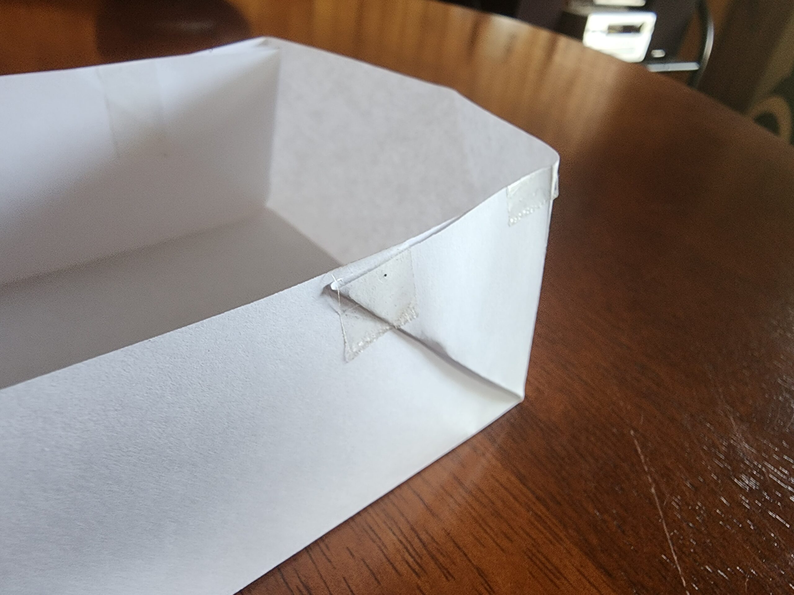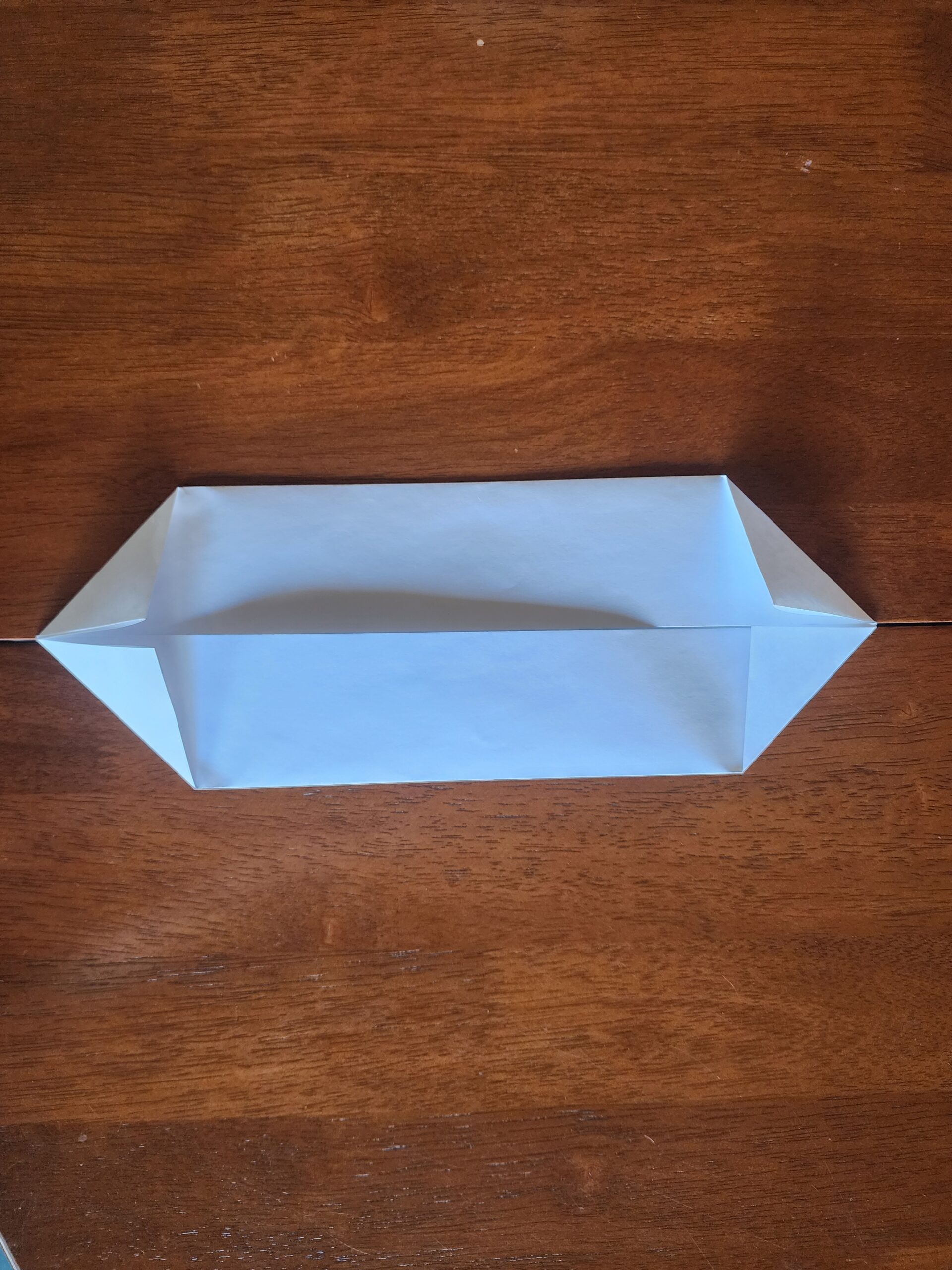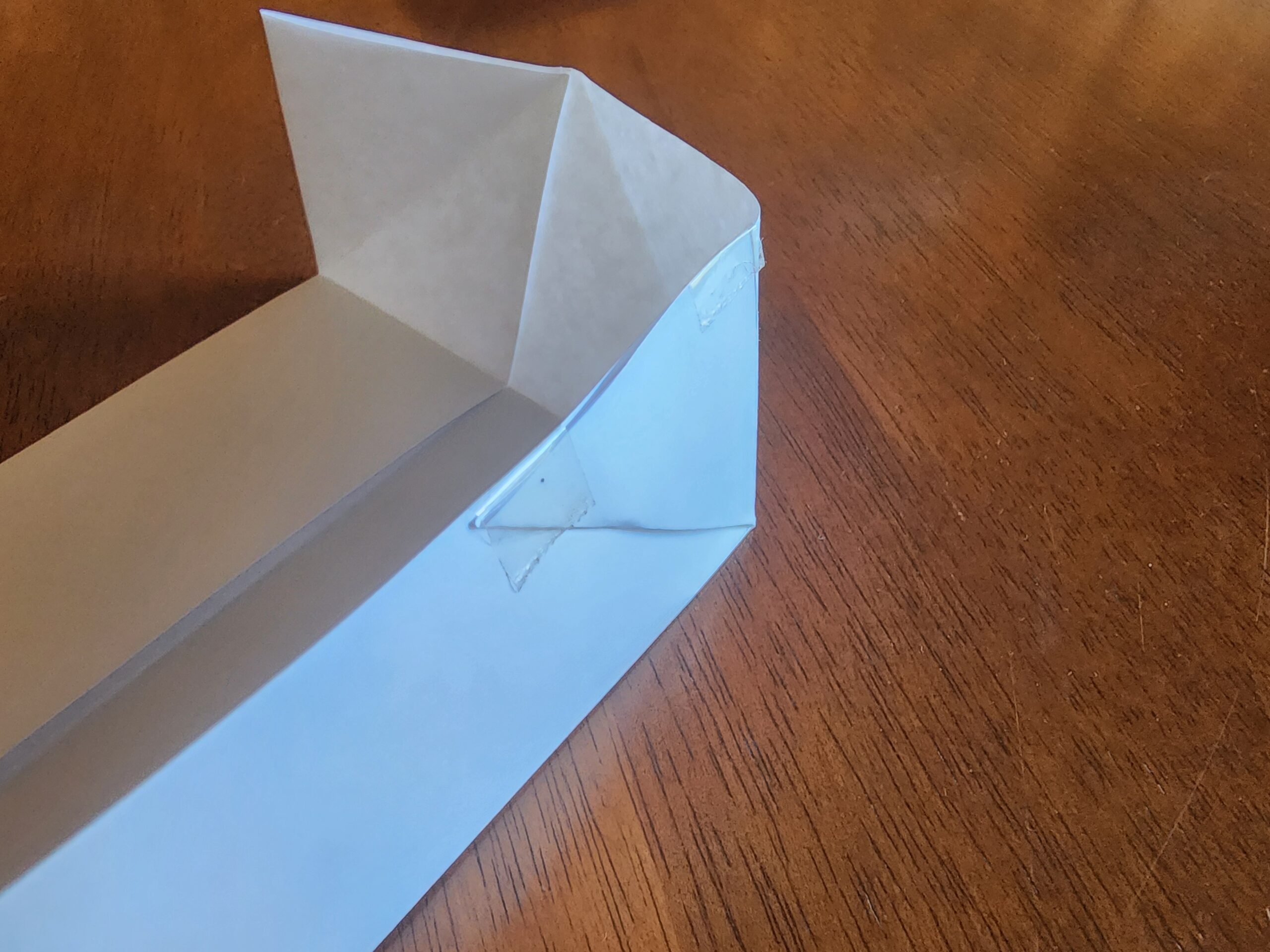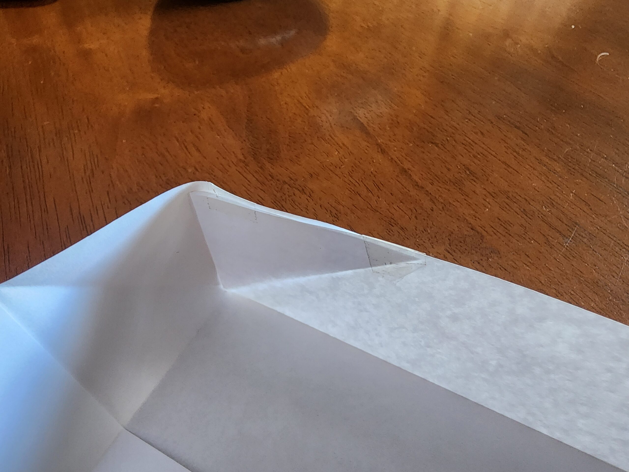 We have demonstrated the appropriate folds below on a piece of paper. You’ll know you have it right when the liner can be pressed tight against the timber, the liner is not stretched, its corners are supported and there is a right angled triangle of excess is against the long edge of the wood.