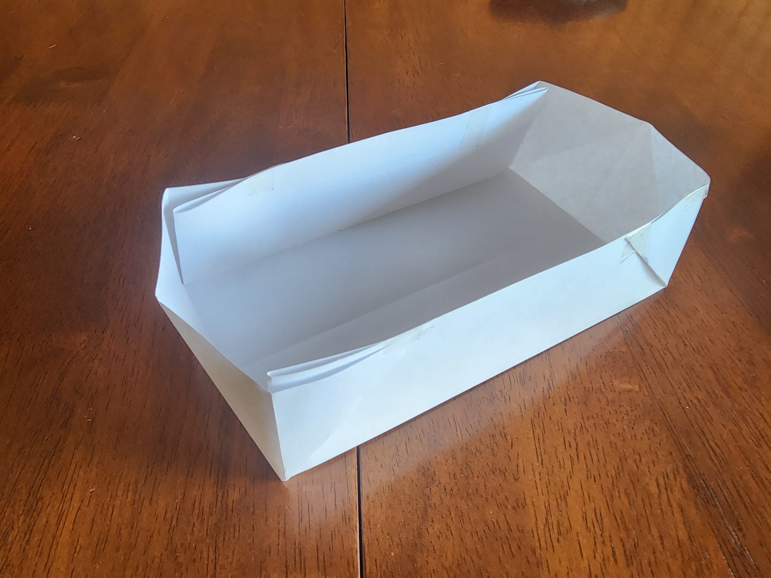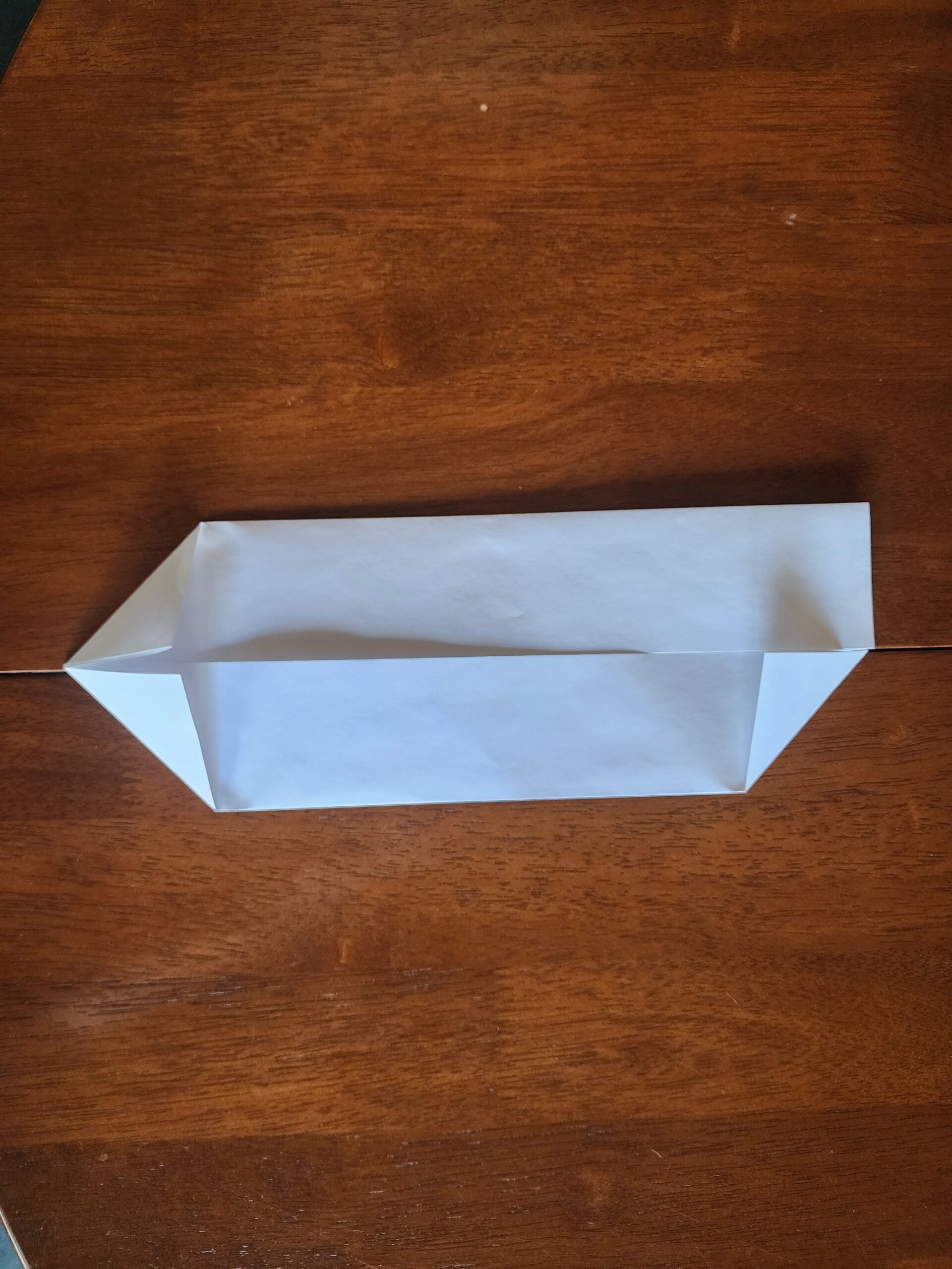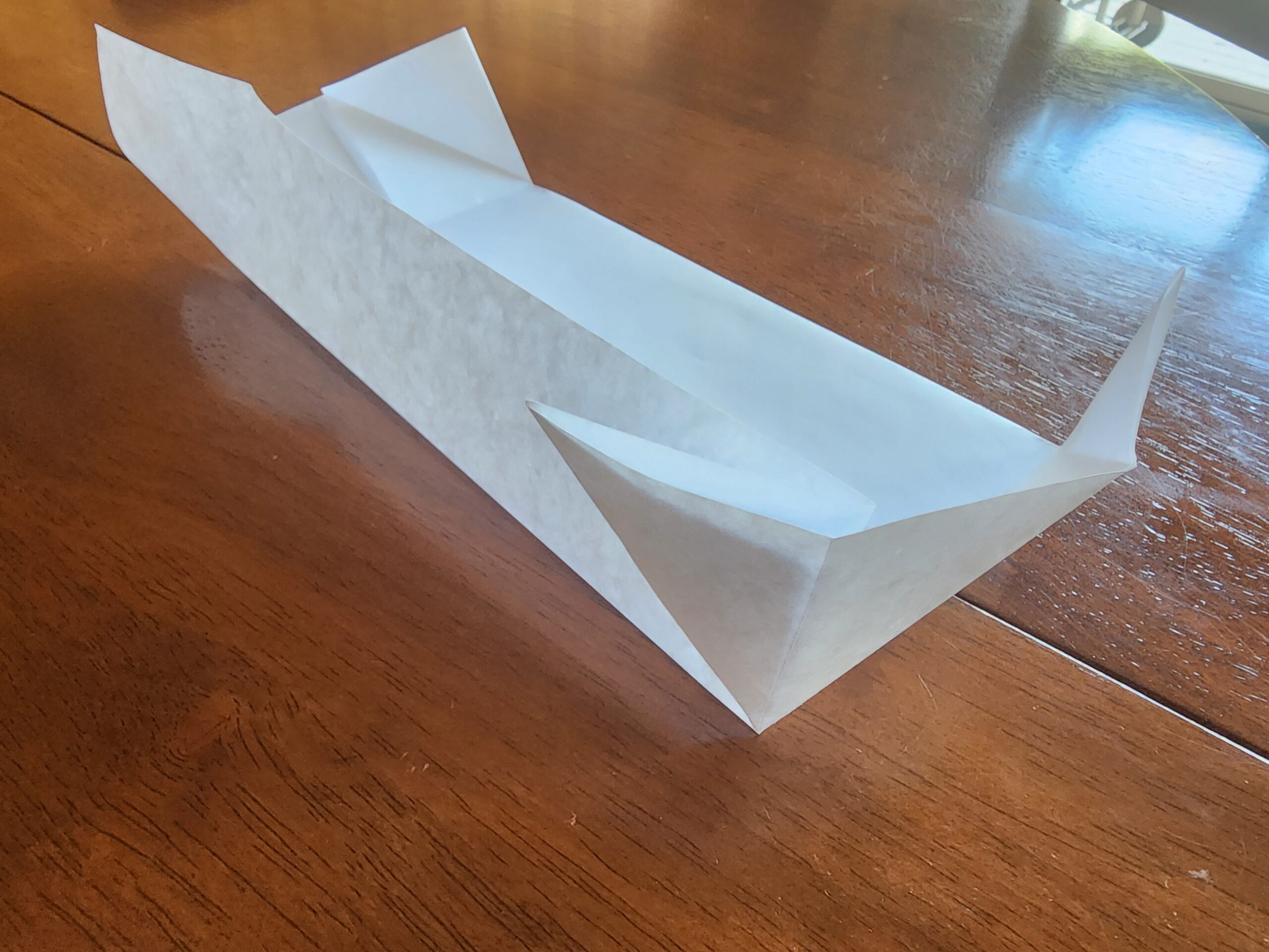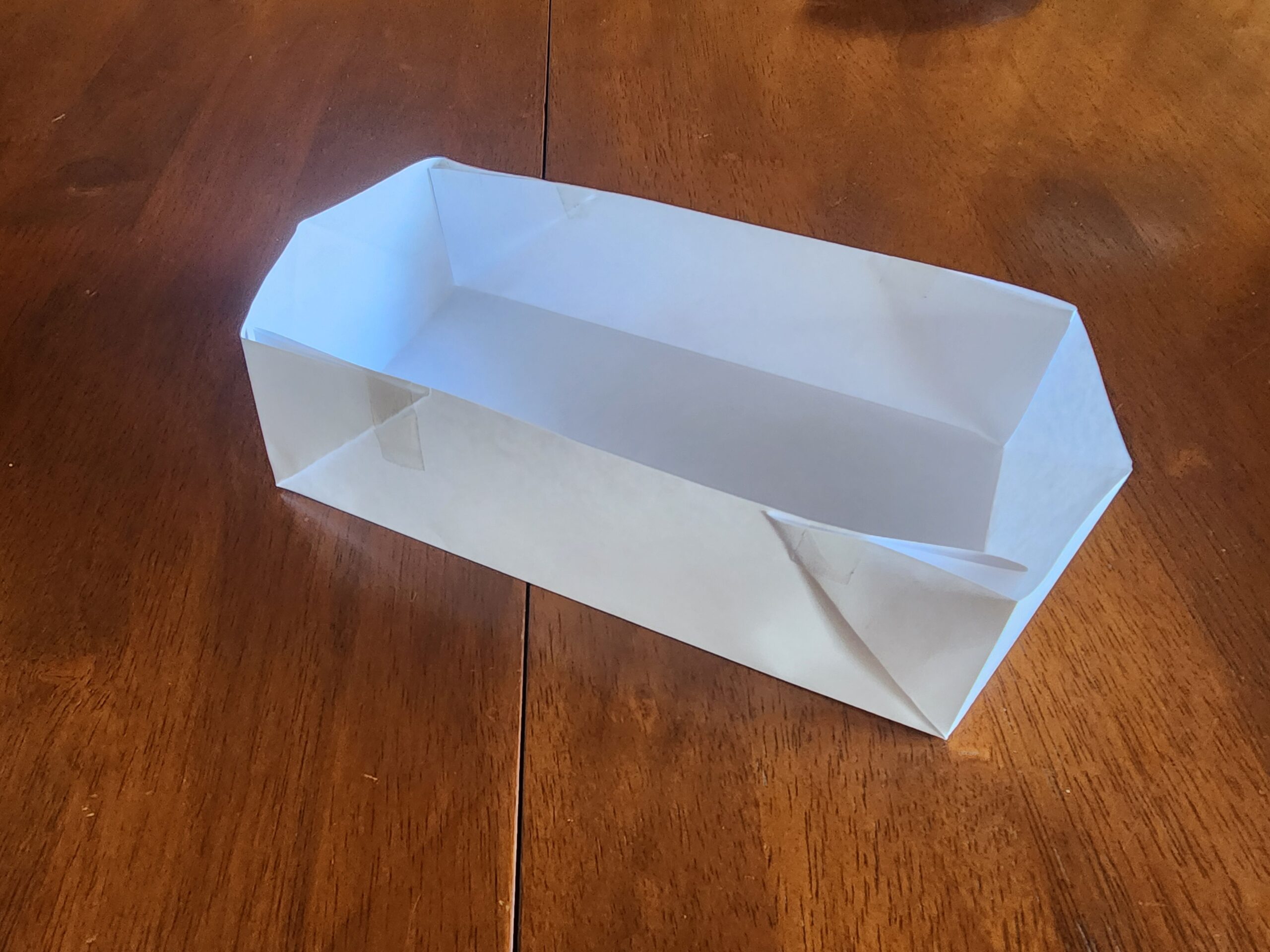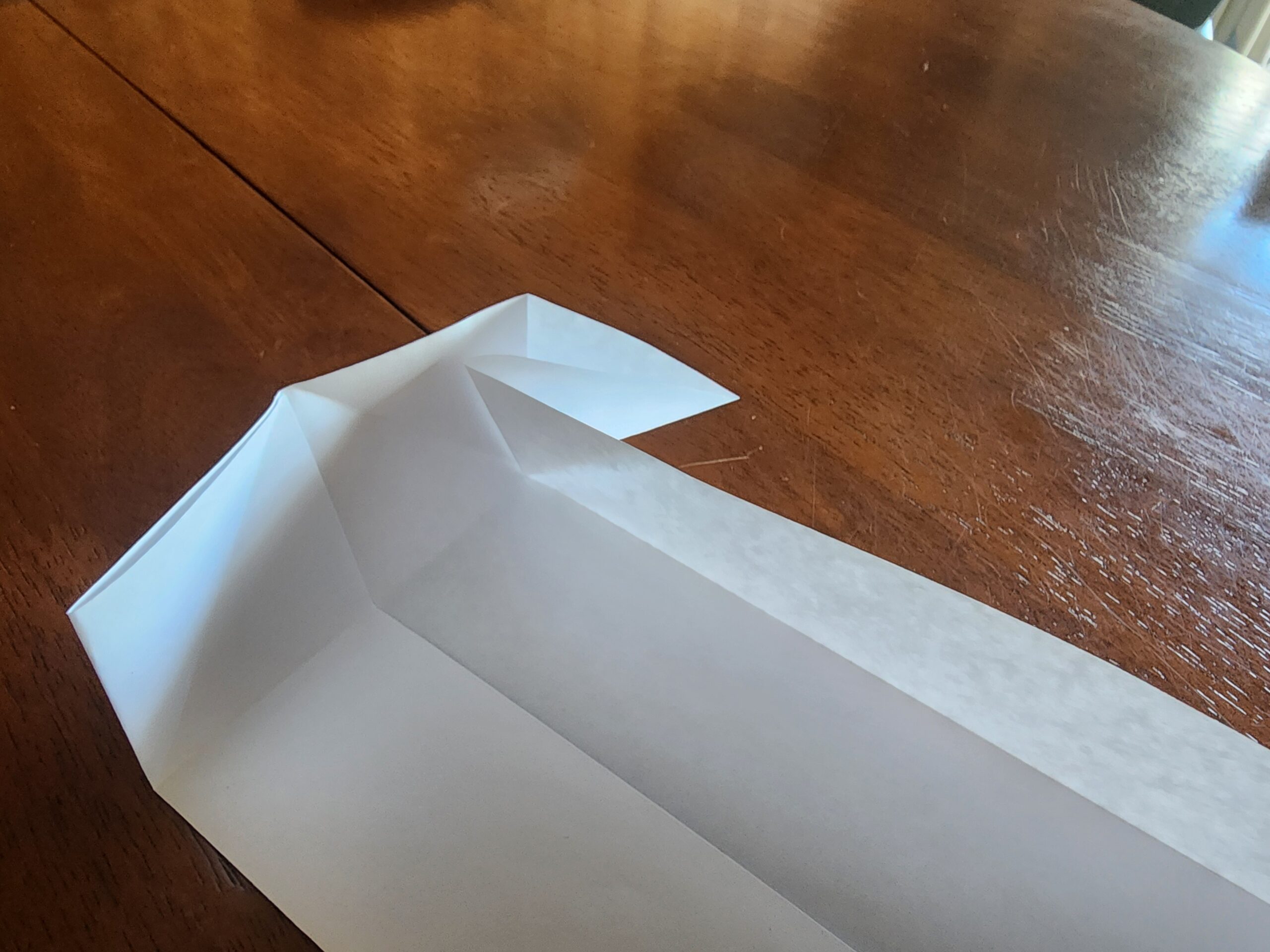We have demonstrated the appropriate folds below on a piece of paper. You’ll know you have it right when the liner can be pressed tight against the timber, the liner is not stretched, its corners are supported and there is a right angled triangle of excess is against the long edge of the wood.