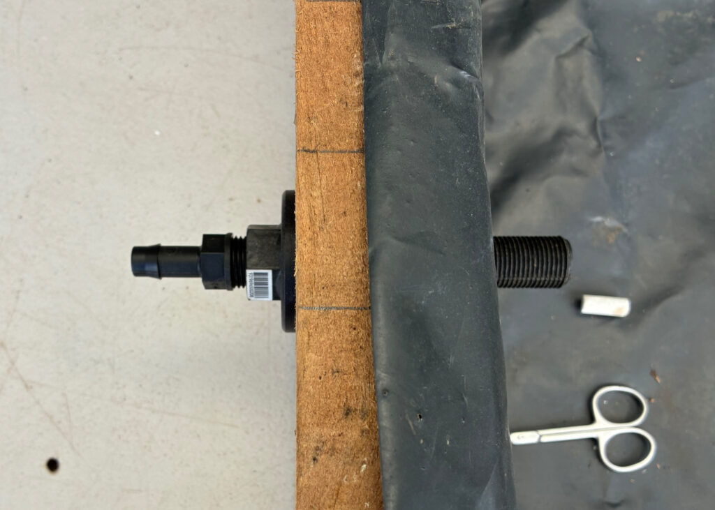 The overflow is one of the most important parts of the bed, so take care when installing it. Insert the tank fitting through the hole in the sleeper and the liner, then secure it firmly. The male threaded end of the tank fitting should be pointing into the bed.