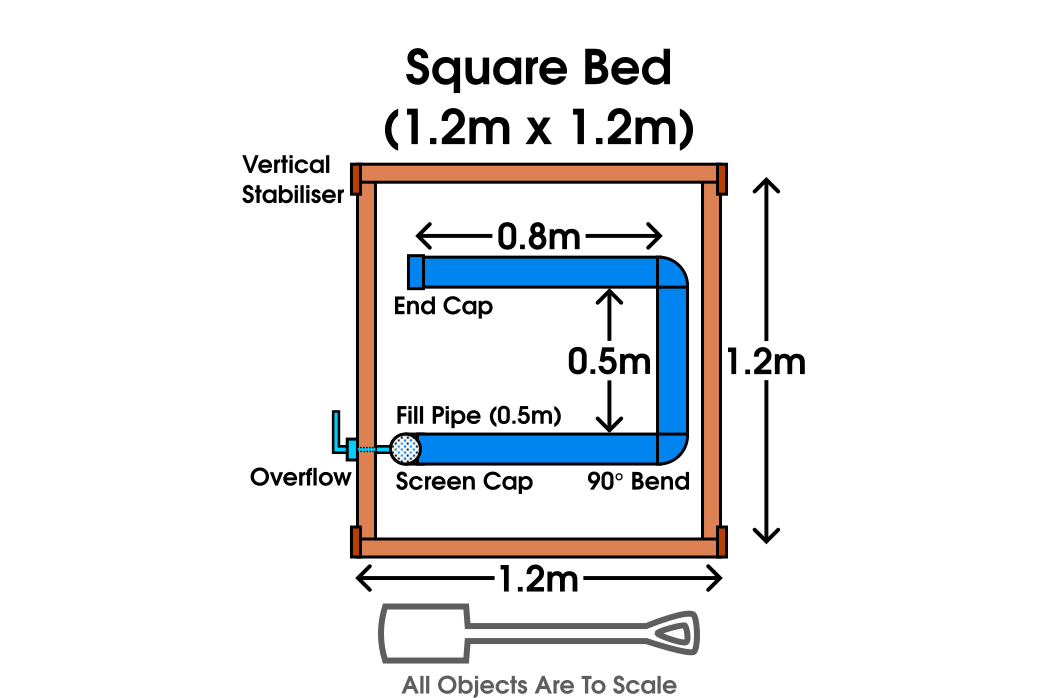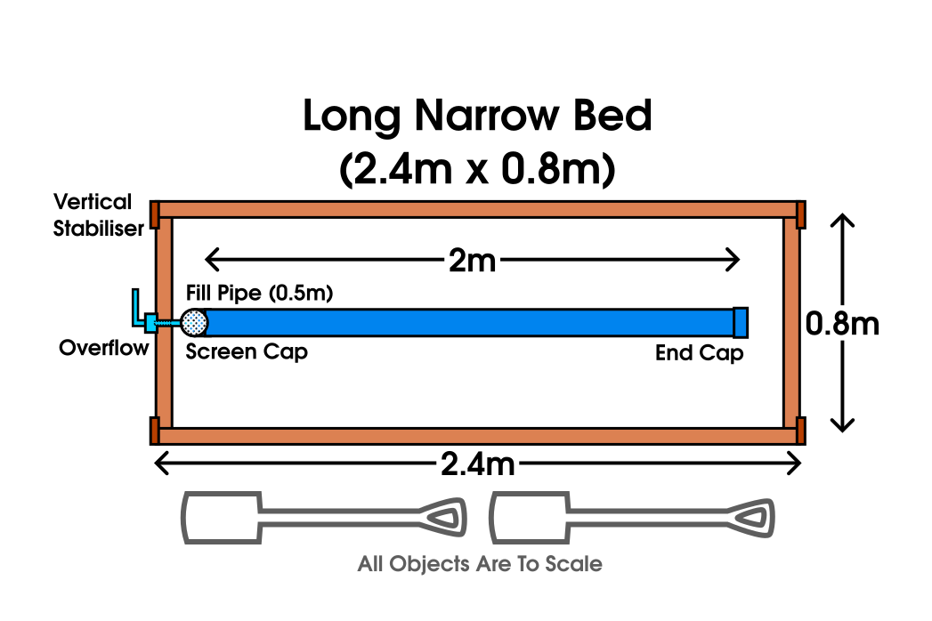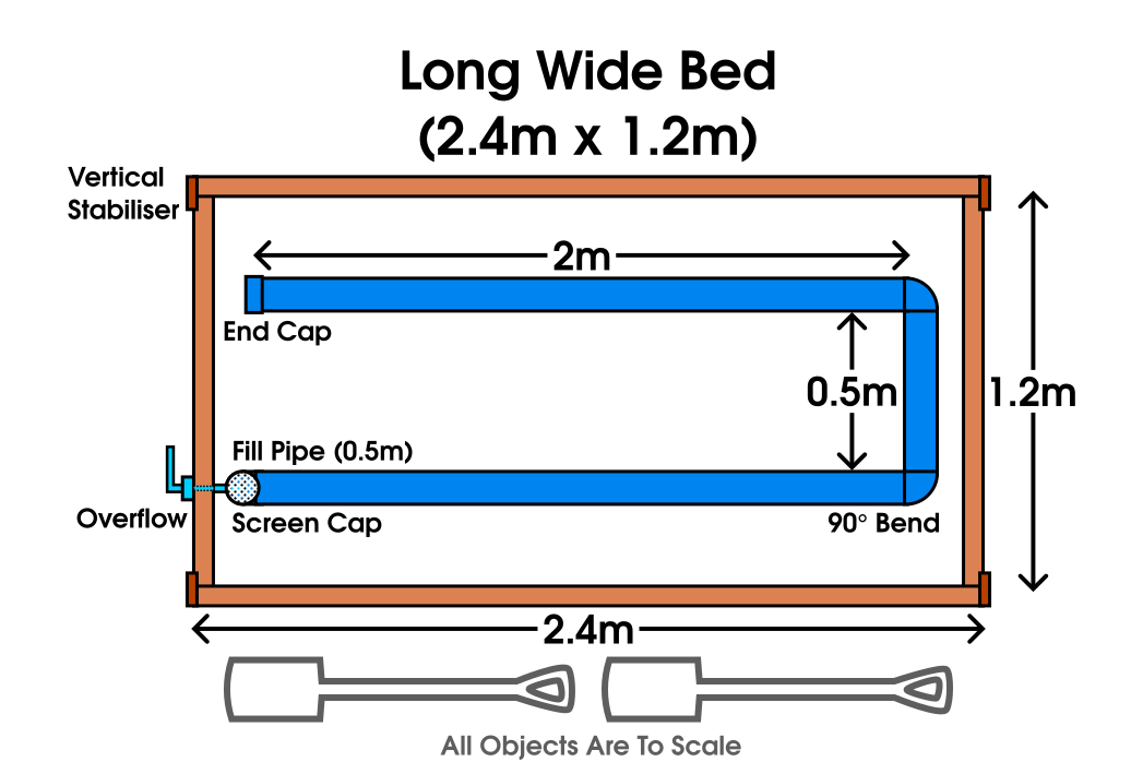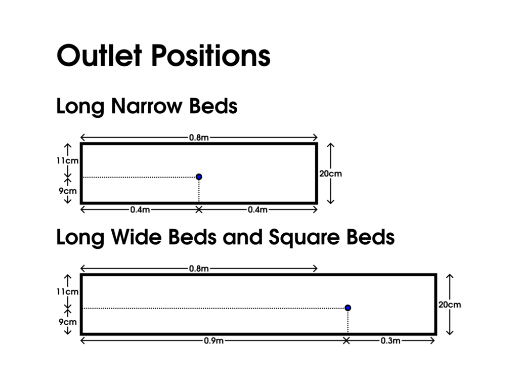 Depending on the type of bed, the reservoir assembly is slightly different. The long narrow bed has a single pipe and the Long Wide and Square beds use a U shaped layout.